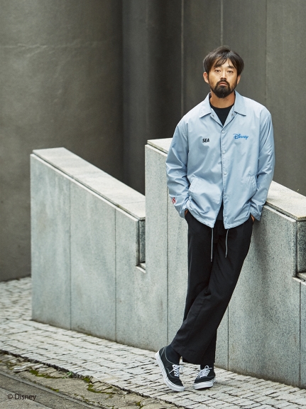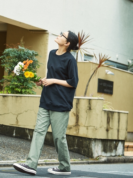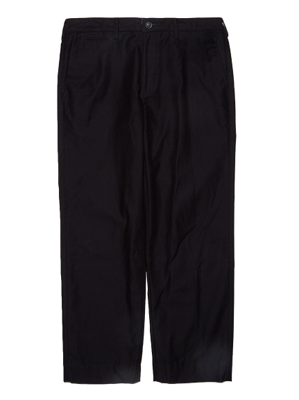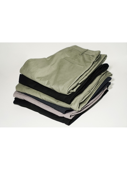 こちらはほど良い横ムラのあるミリタリーテイスト素材のチノパン。上質な起毛感がありノータックのワイドシルエットは、カジュアルな古着からシンプルなラペルジャケットにも合わせやすい。これ一本あればと言えるようなパンツです。