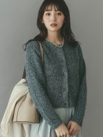 光に揺れるラメシャギー素材が、冬のコーデに華やかさを添えるカーディガン。毛足のある編地が立体感を作り、コンパクトなシルエットにボール状の釦がさりげないアクセントになっています。裏面には綿素材を使用しているのでチクチクせず、快適な着心地をキープ。セットアップとして同素材のラメシャギーニットスカートと合わせれば、ホリデーシーズンの特別な装いに。ブライトツイルタックパンツと合わせたスタイルもおすすめで、カジュアルから華やかなシーンまで幅広く活躍します。キャッチーなラメ感がありながら落ち着きのあるデザインで、冬の装いをぐっと華やかにしてくれる一枚です。