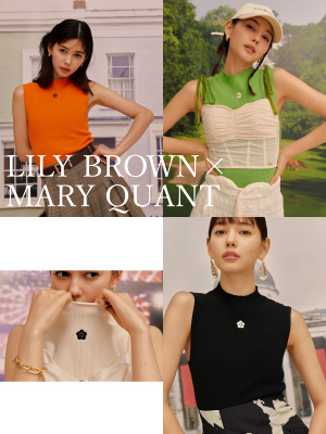 胸元には「MARY QUANT」、袖口には「LILY BROWN」のロゴ刺繍が施された豪華♡トレンドのシアートップスを襟ぐりのパイピングで、ちょっぴりレトロに仕上げ。使いやすい白黒と、オリジナルのチェック柄を浮かべたブルーの3色展開です。