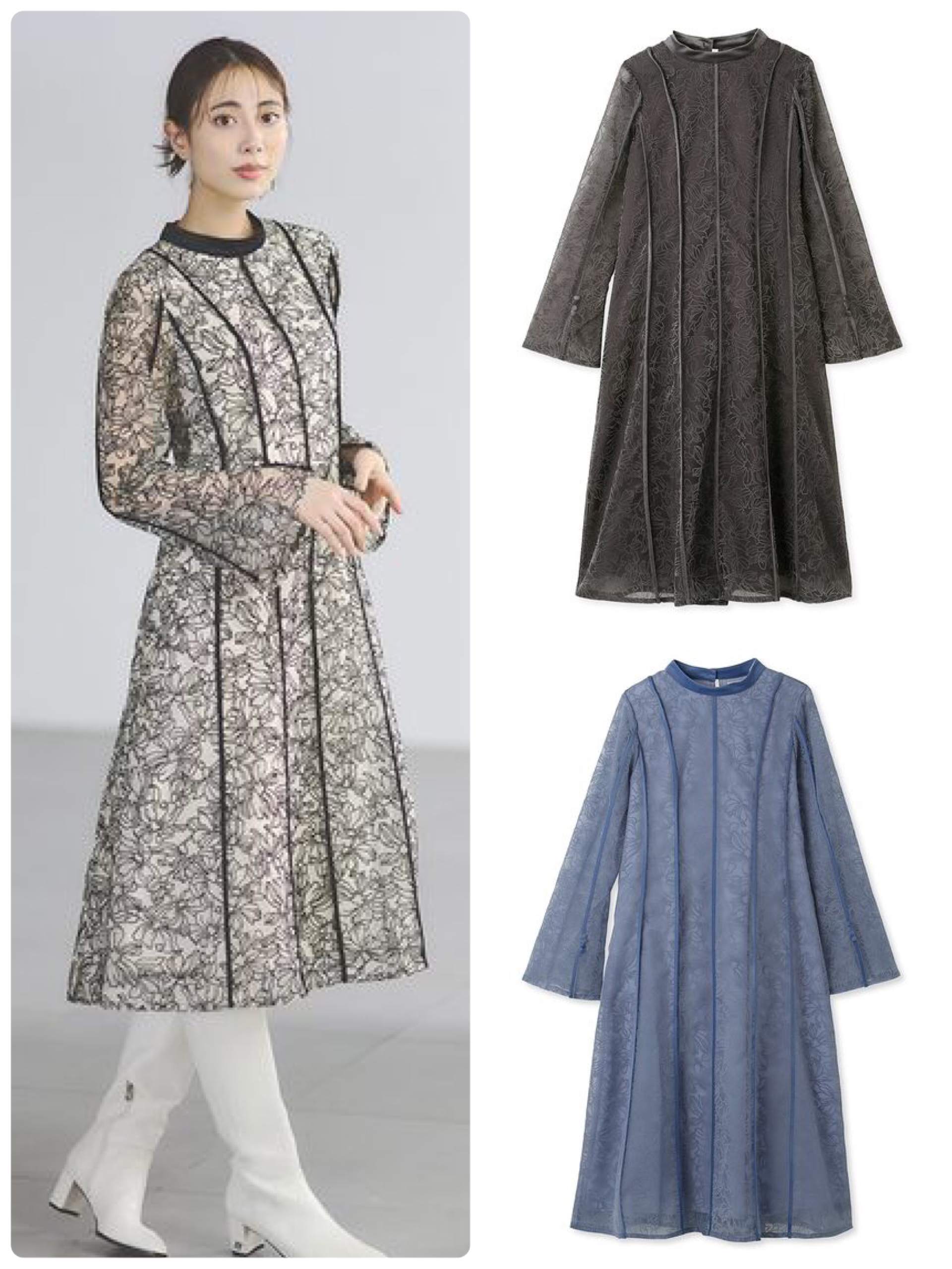 カラーによって印象がガラリと変化する、フロッキープリントのワンピース。柄はCELFORDのオリジナルで、日本の工場で作られた貴重なものだとか。ほっそり見える縦のパイピンも素敵です。フロッキープリントパイピングデザイン/セルフォード