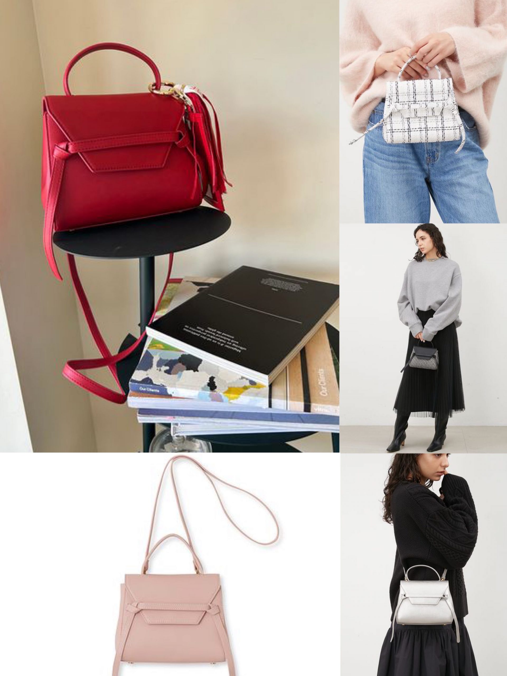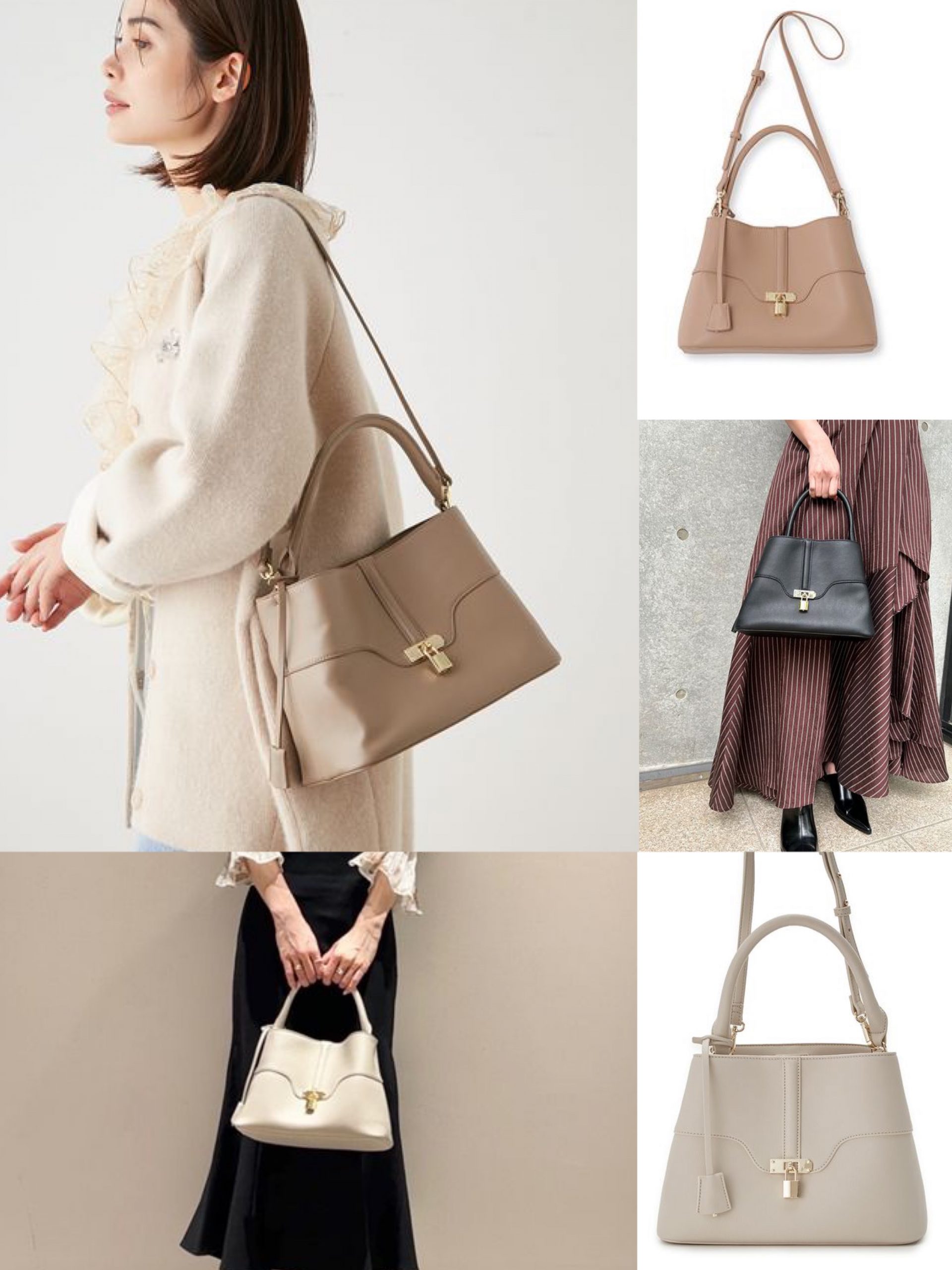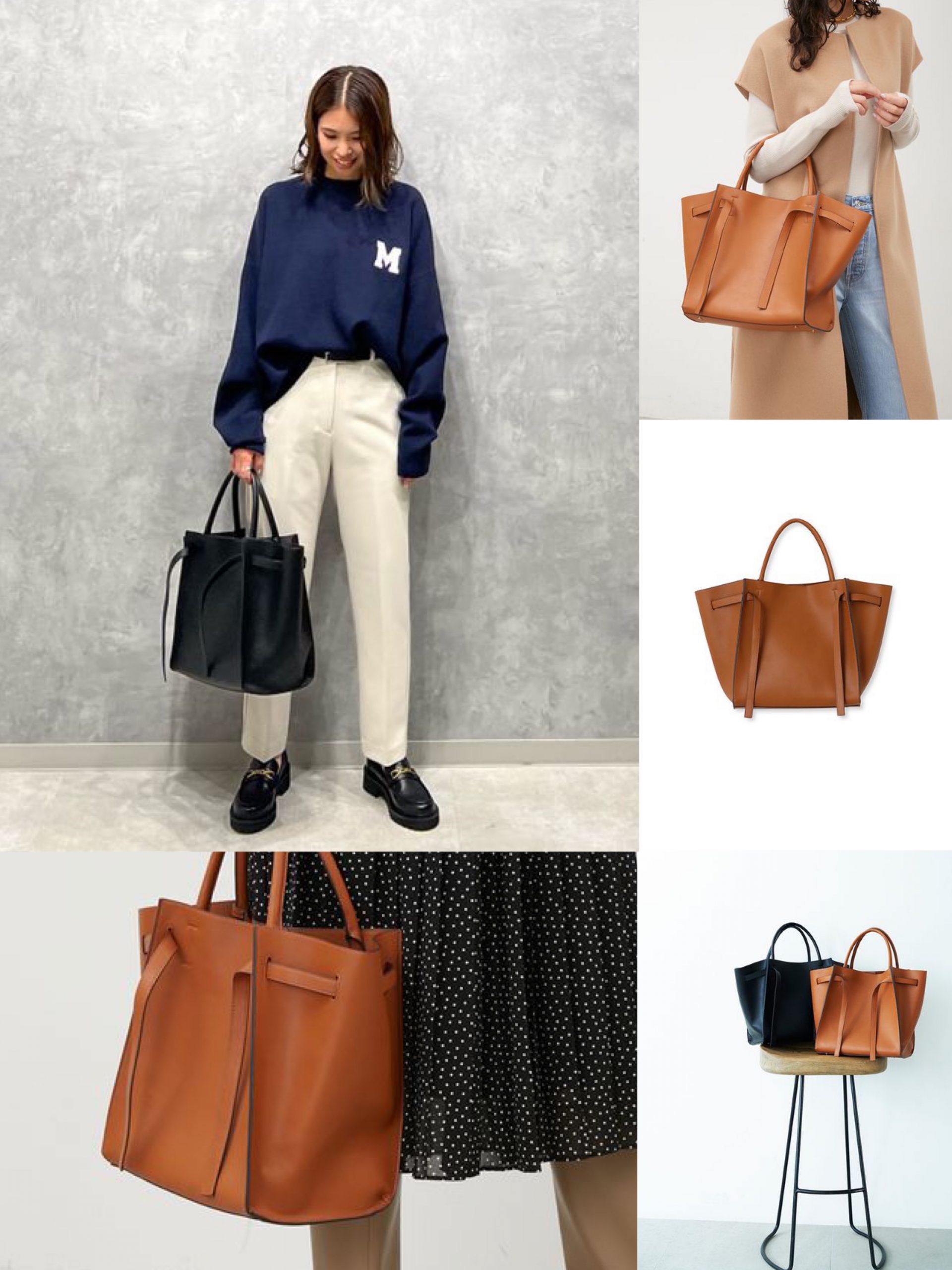 持つとバッグの中央部分がこなれた感じに凹む、モードなミドルハンドバッグ。マチがしっかりあるので、見た目以上に収納力があるのが特徴。仕事のできそうな、かっこいいデザイン。