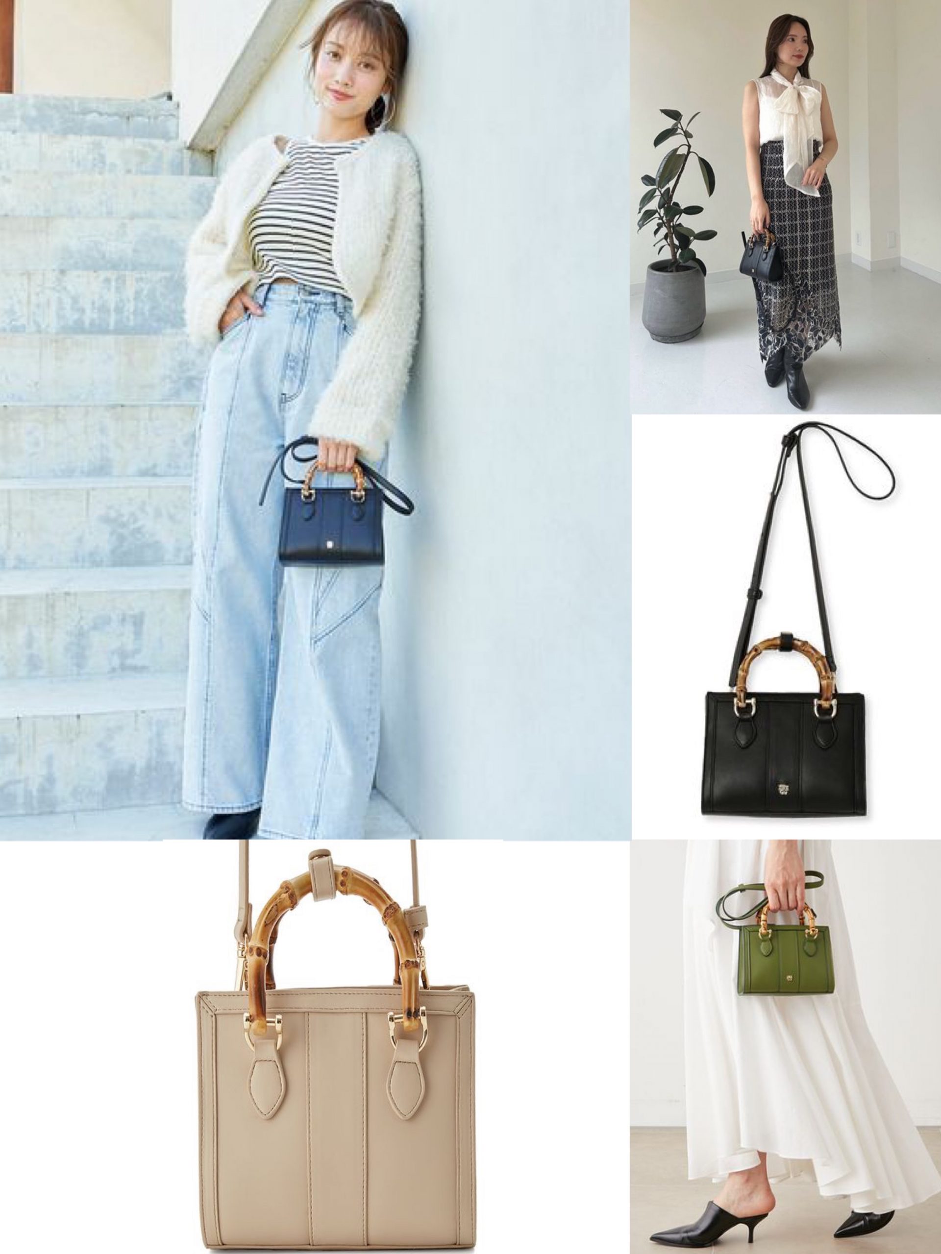 バンブー素材の取っ手がポイントの、かっちりめバッグ。カジュアルはもちろんパーティーなどにもぴったりのサイズ感で、クラシカルで長く使えるデザイン。