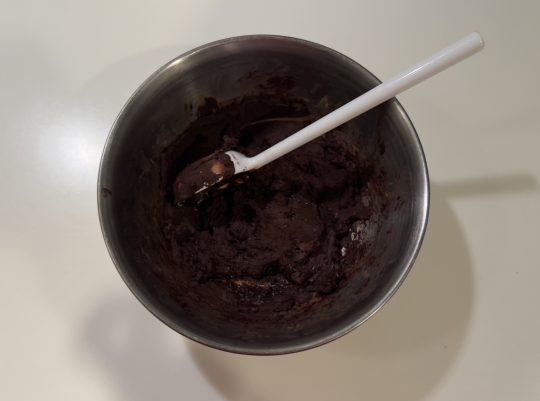 ①ココアパウダー、甘酒、メープルシロップをよく混ぜ合わせる(泥状になるまで根気強く混ぜます!)