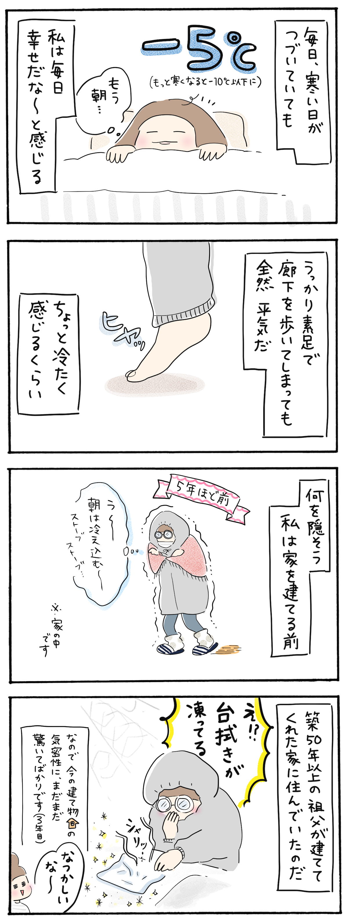 今のお家はすごいな〜、台拭き凍らないな〜、廊下素足で歩けるな〜
