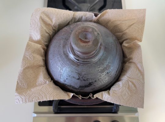 私は唐津で作陶をされている女性作家の土屋由起子さんにオーダーして作っていただいた、黒唐津の土鍋を使用しています。