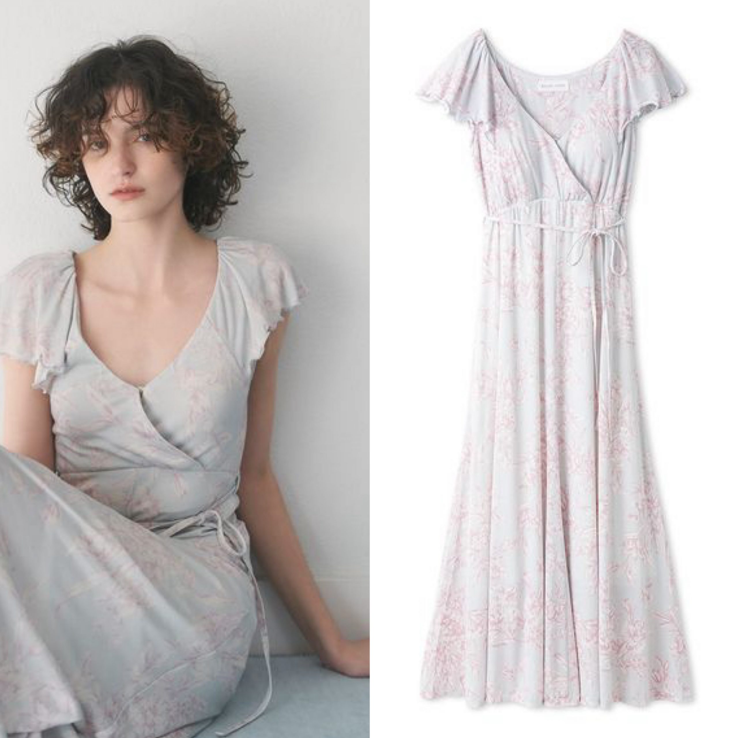 こちらはぐっとフェミニンな印象のSNIDEL HOMEのカシュクールワンピース。胸元ははだけにくいようにボタン付きになっているので安心。こちらはカップインタイプになっているので、一枚で着られるのも嬉しい。色っぽい。【サクラコレクション】カシュクールワンピース/スナイデルホーム