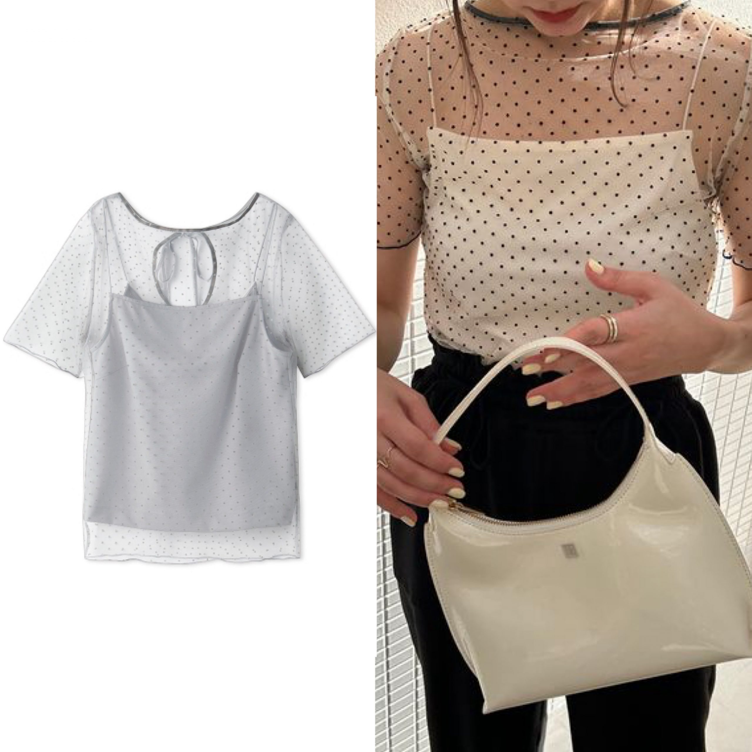 シンプルなシアーカットソーにこれまたシンプルなキャミがついた、今年らしい軽やかなデザイン。特にドット柄は可愛らしさとヘルシーさ両方出せるのが特徴。シアーカットチュールトップス/スナイデル
