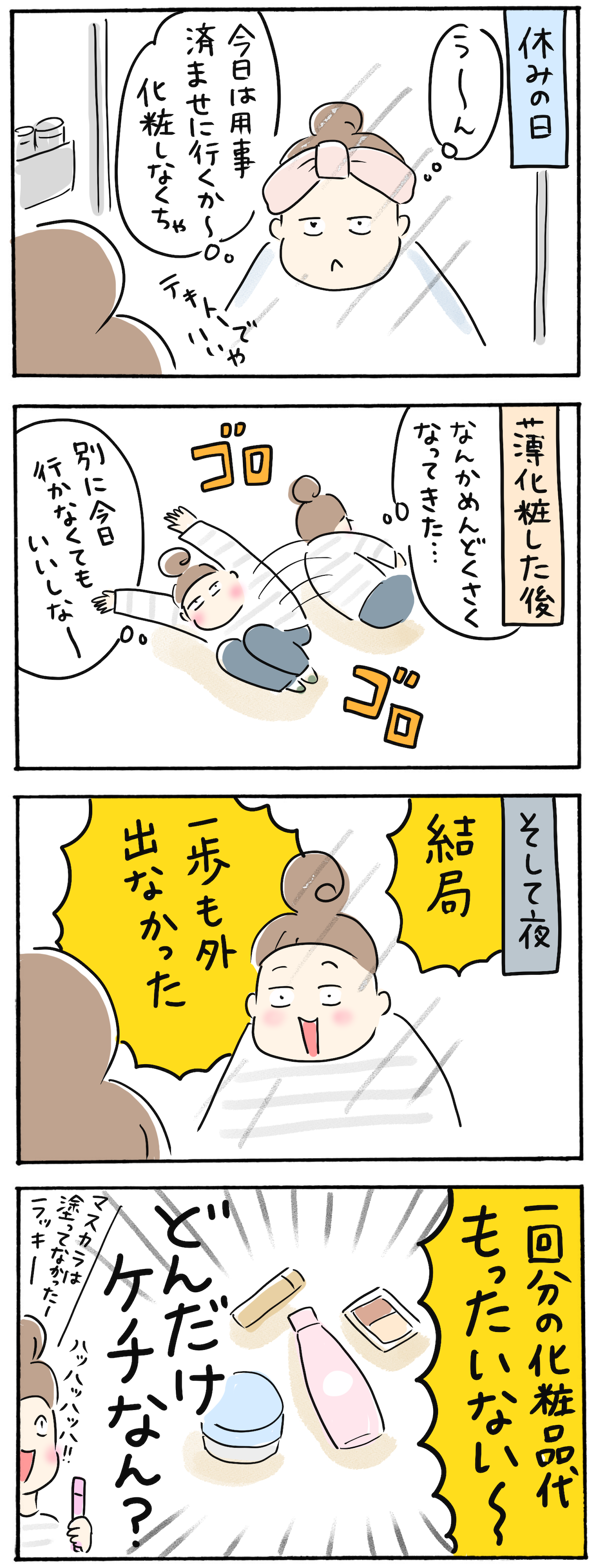 家から出ないか分からないし、一応メイクして過ごしたけど誰にも会わなかった日は損したきがしてしまうのよ、、、。