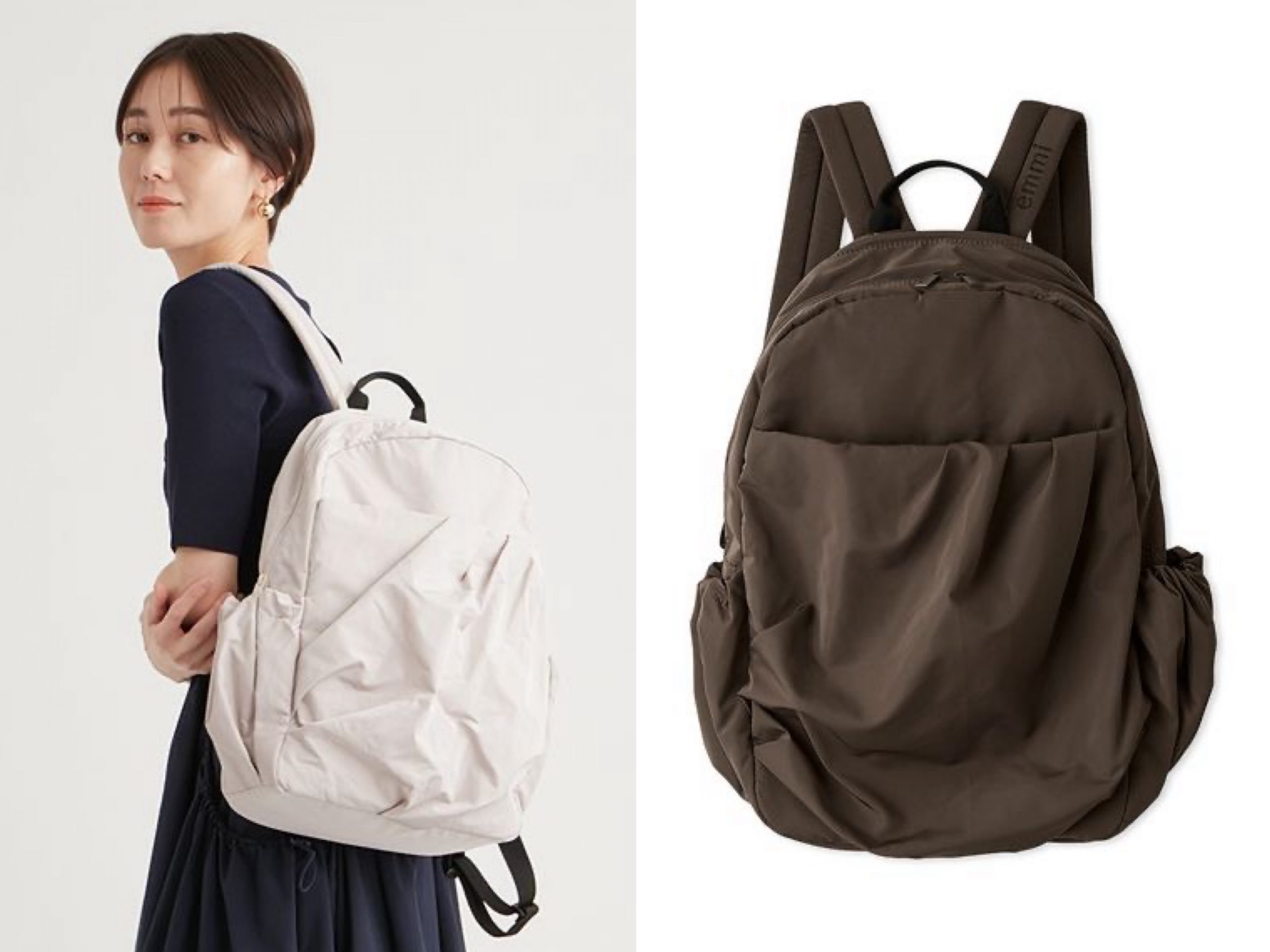 emmiといえば、バックパック。毎シーズン軽くて機能がたくさんついた使い勝手のいい名品を生み出し続け、そして常にソールドアウト。正直、見つけたらすぐ買ったほうがいいと思います。女性らしく持てる、デザインや色が秀逸。【ONLINE限定カラー】eco 撥水ギャザーボディーバックパック/emmi