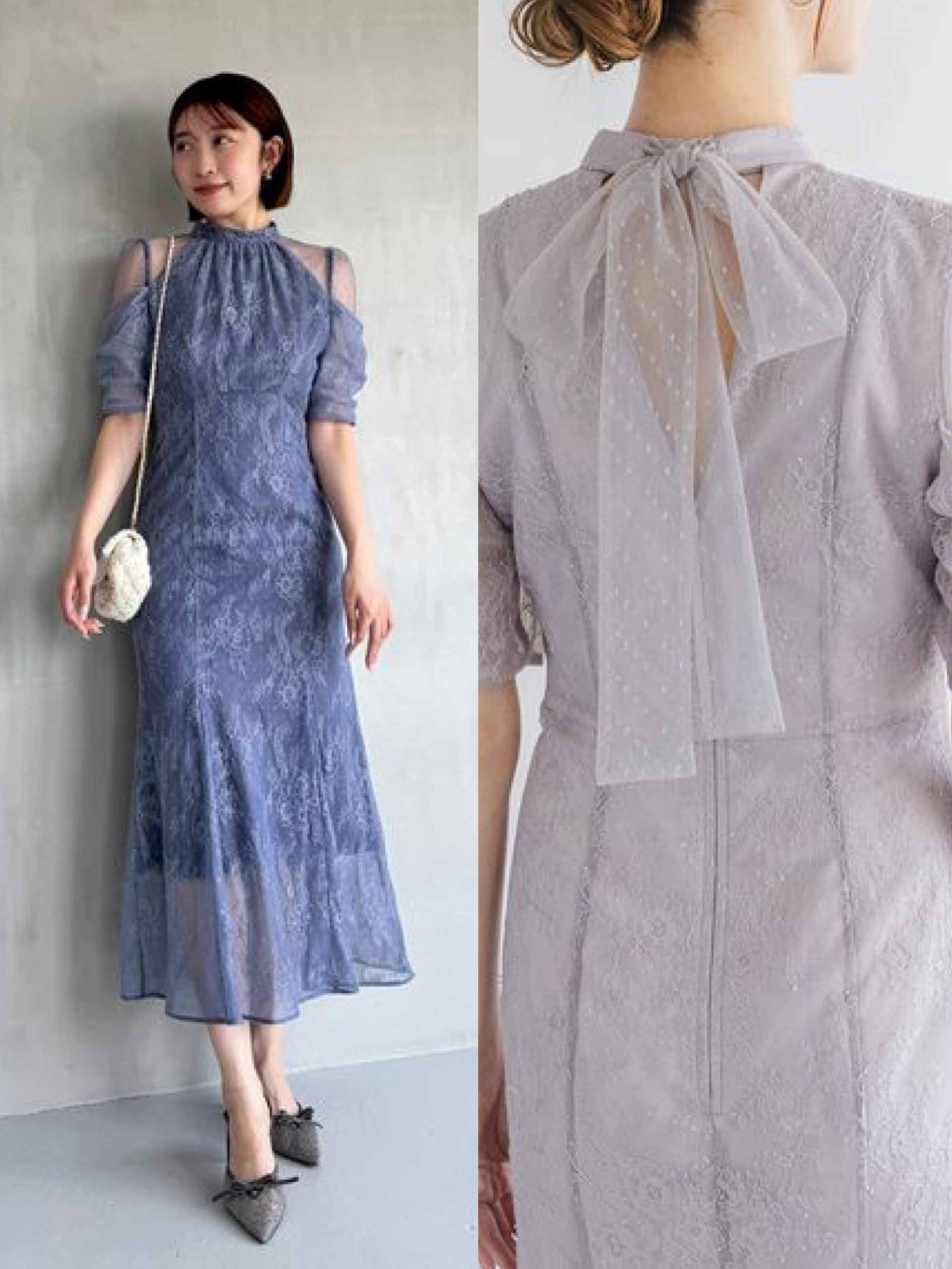 繊細なレースとチュールに身体が包まれる感覚の華やかなドレス。ハイネックなので肩や背中が透けて見えても上品。ウエーブ体型さんに特におすすめのドレスです。シアーショルダーレースドレス/SNIDEL