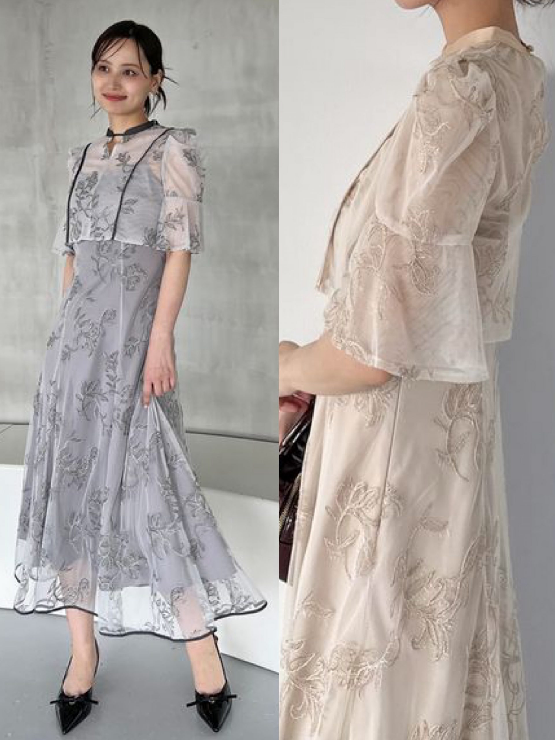 大人気の丈短ボレロがセットでついた、可憐なボタニカル柄刺繍ドレス。透け感も計算された、レイヤードスタイルが楽しめます。キャミドレスは1枚でも着まわせます。エンブロイダリーボレロセットドレス/SNIDEL