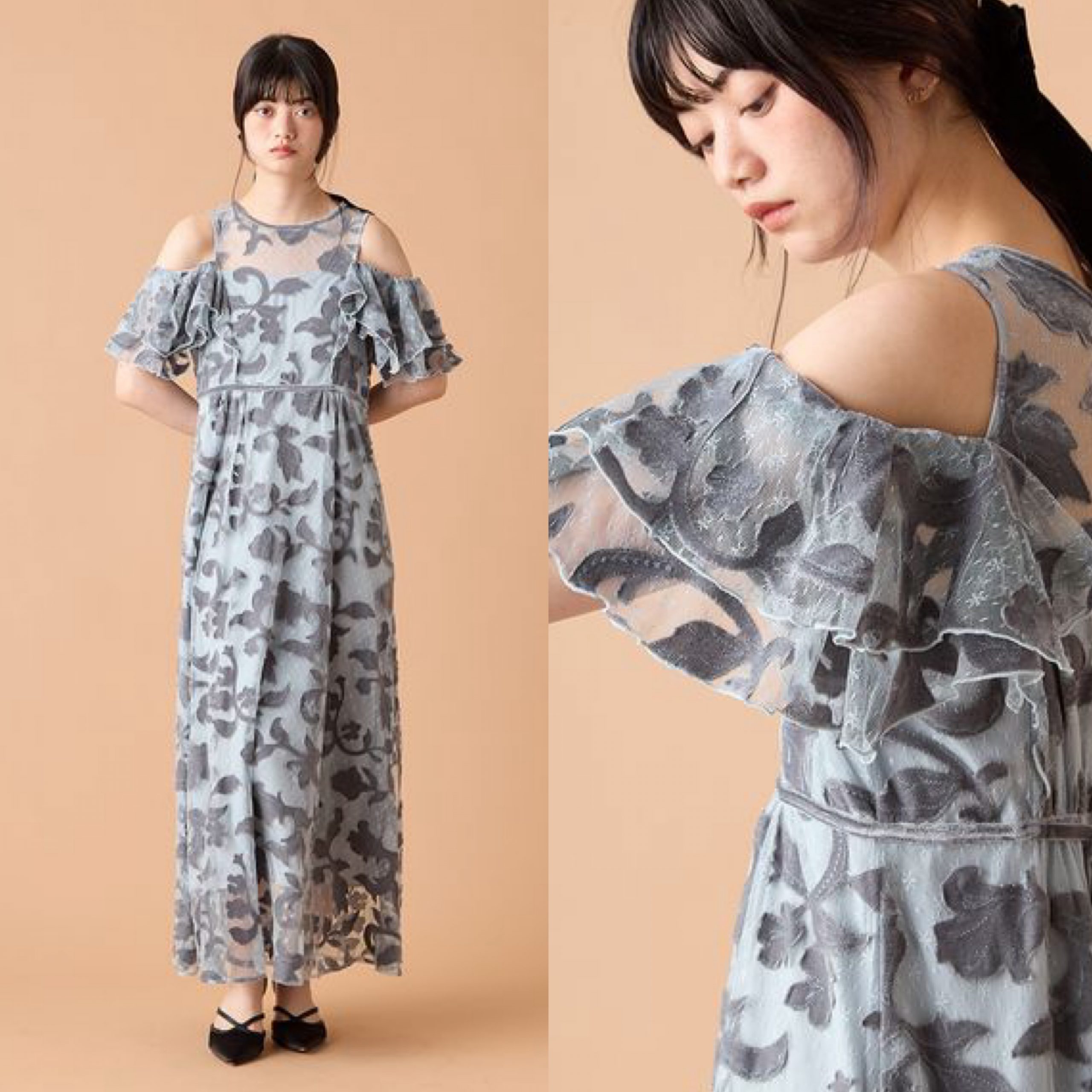 チュールの上にボタニカル柄のベロアを重ねた、大人っぽいオケージョンドレス。袖は肩出し有無の2WAY仕様。手の込んだドレスです。オーナメント2wayベロアドレス/LILY BROWN