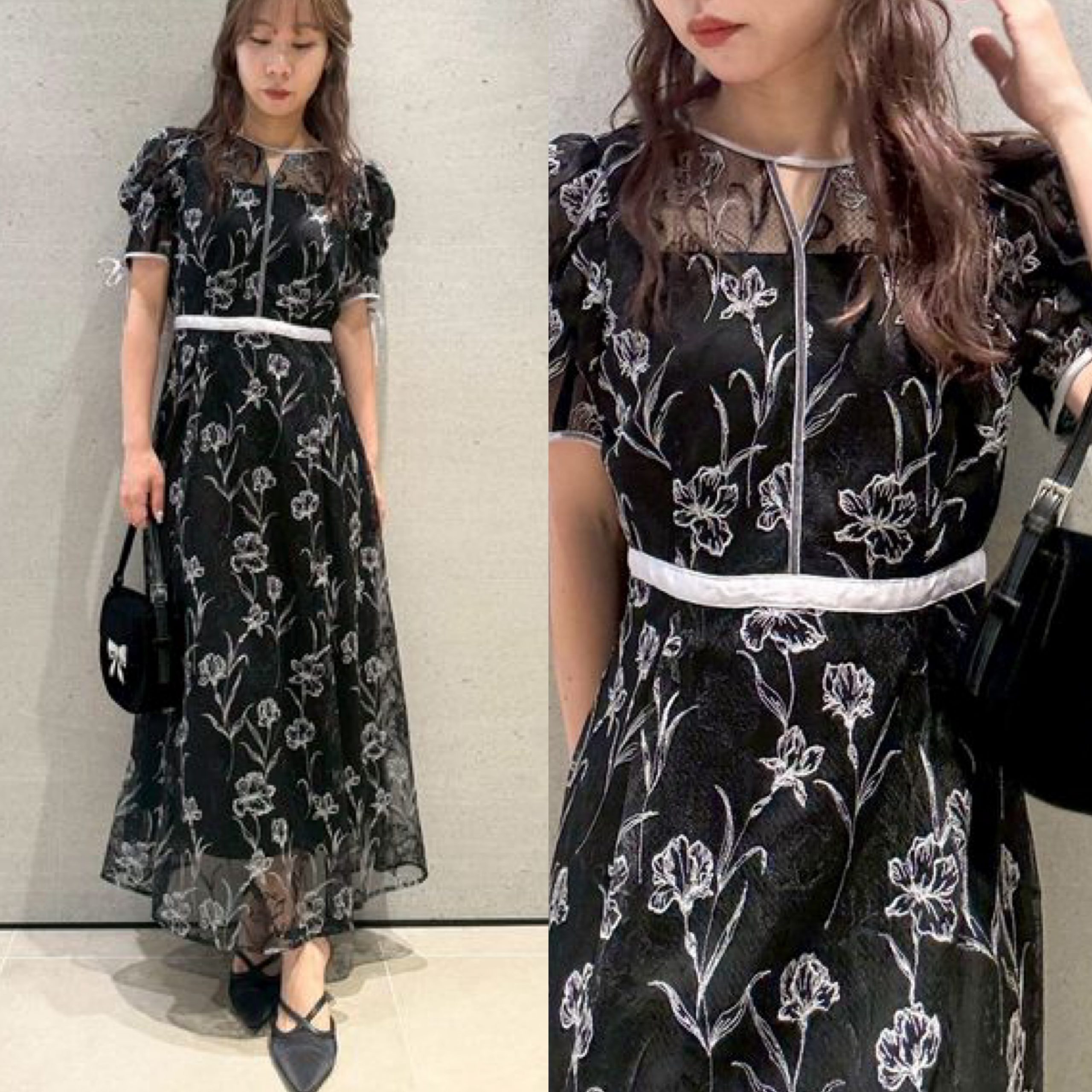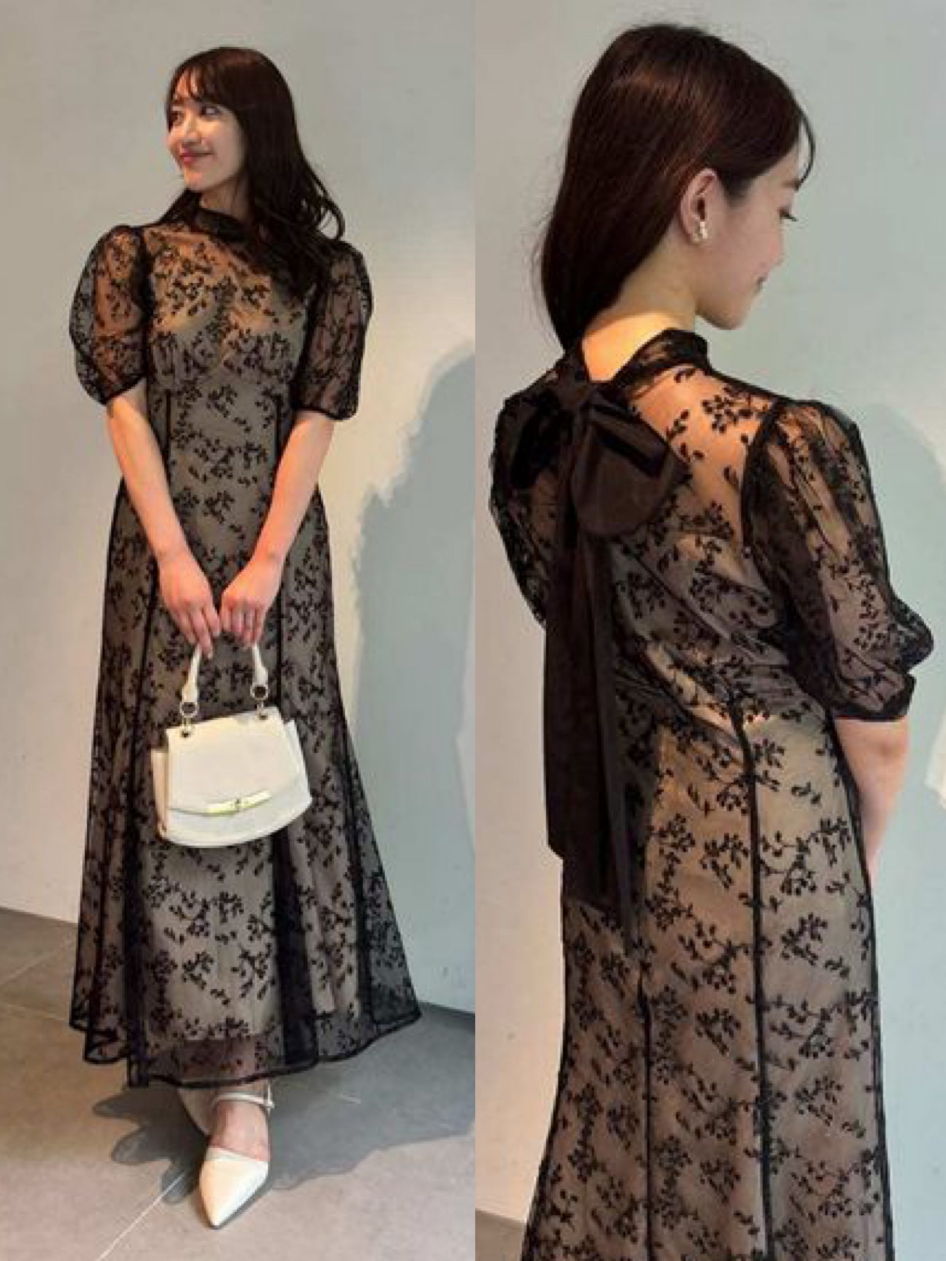 エアリーなメロンチュールを使った、大人気のエンブロイダリードレス。人気すぎで残りブラックのみ。ベロアのテープが細見えのポイントに。ラインフラワーエンブロイダリードレス/LILY BROWN