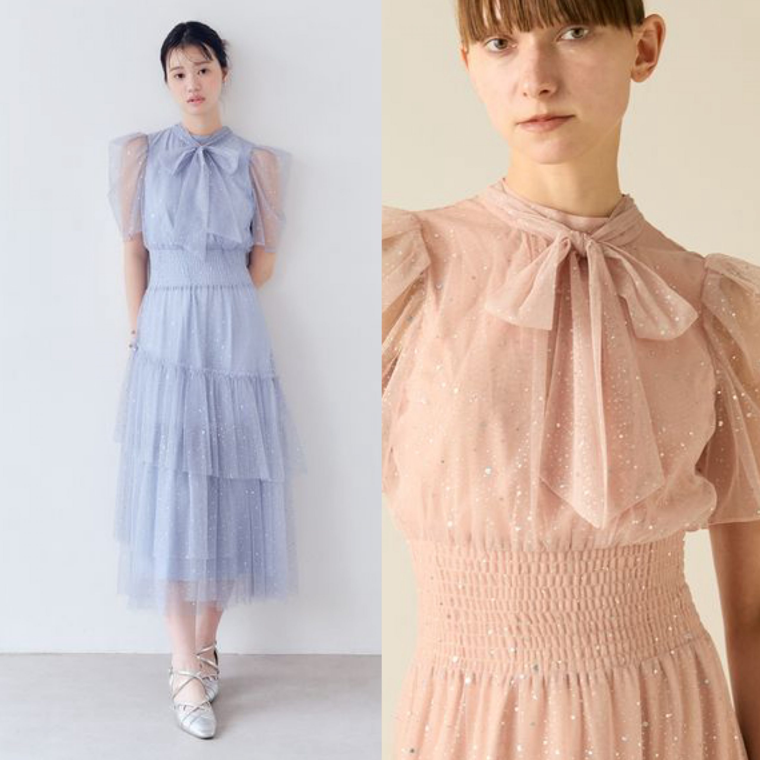 ラメがたっぷり散りばめられた、ロマンティックなFURFURのドレス。淡いパステルのほか、ゴージャスなブラックもあり。【限定サイズ】ハーフスリーブラメチュールドレス/FURFUR