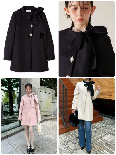シンプルになりがちなコートにリボンディテールを加え、アウターを着ても脱いでも可愛いを実現したリボンコート♡襟元にあしらったボウタイリボンが視線を引きつけ、顔まわりに華やぎをプラス。