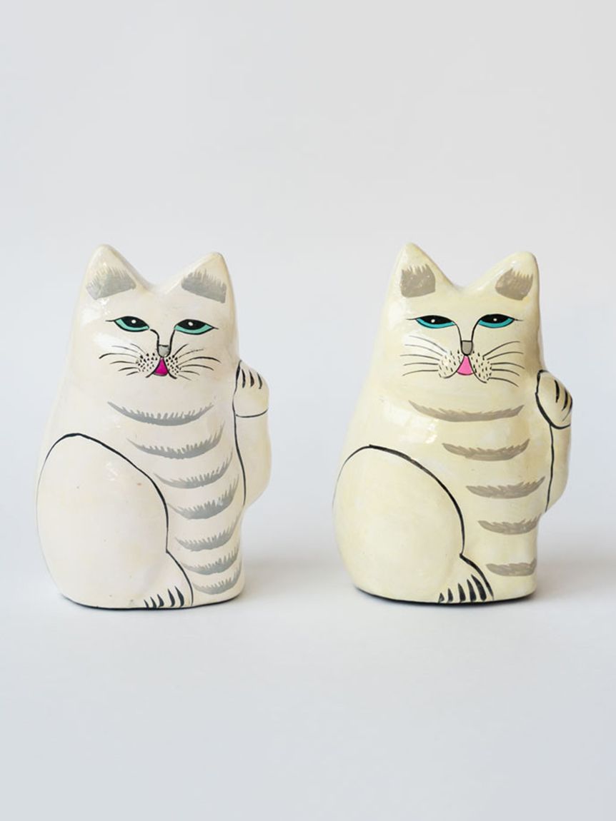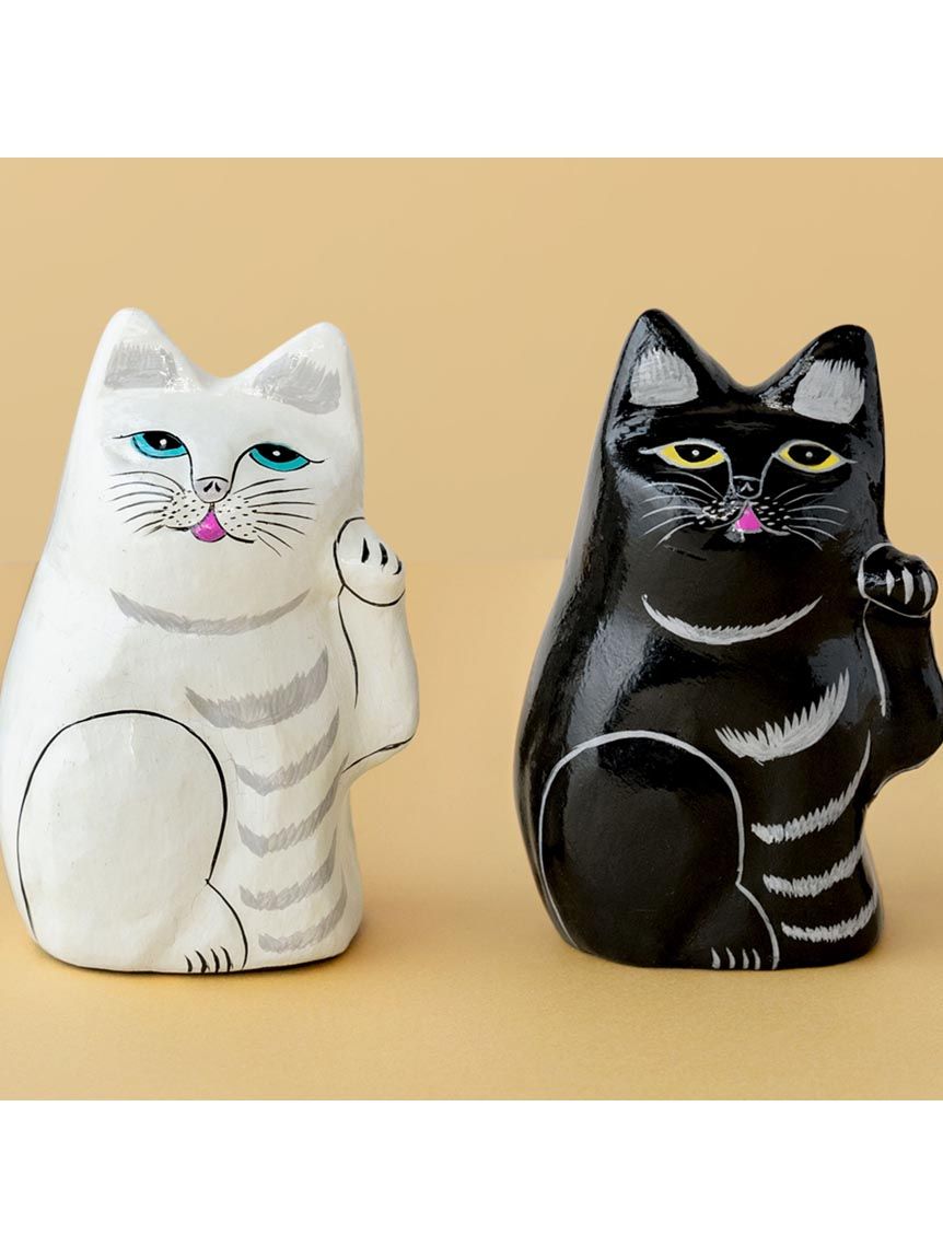 インドの伝統工芸である紙粘土細工(ペーパーマッシュ)にハンドペイントを施した招き猫の置き物。